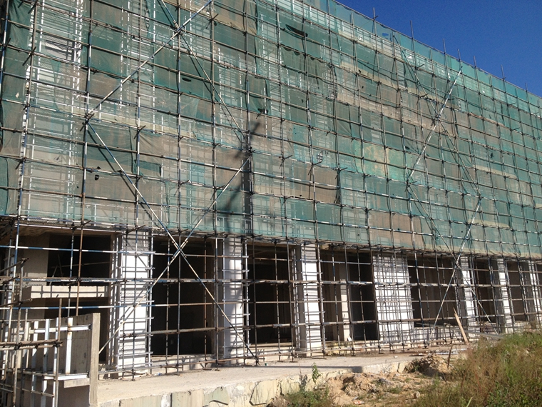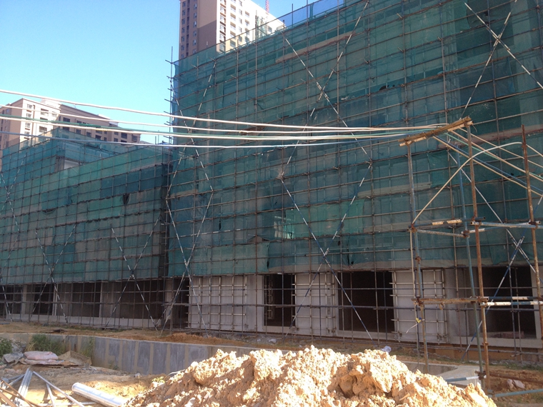 (二)写字楼及商业部分外墙装饰:1栋大面完成;6栋即将开始面漆施工;7、8栋干挂石材主龙骨完成90%。