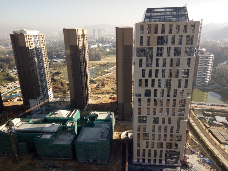 (二)公共部分装修(楼梯间、走道及电梯前室):住宅部分:2、3、4、9、10、11、13、14栋地砖铺贴及墙面第一道腻子大面完成;2、3、4、14栋电梯前室吊顶石膏板封顶已完成。写字楼部分:1栋完成8-12、14-29层地砖铺贴。